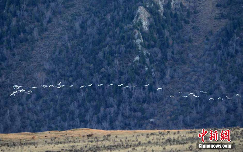 Rows of swans fly over the mountain area of Xinjiang. Swans began to fly away from Xinjiang as it gets colder in October. (Chinanews.com/Hu Re)