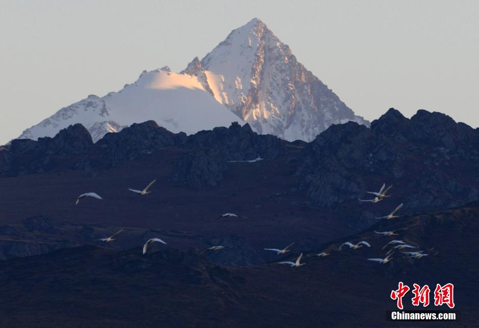 Rows of swans fly over the mountain area of Xinjiang. Swans began to fly away from Xinjiang as it gets colder in October. (Chinanews.com/Hu Re)