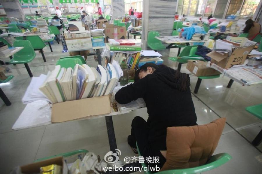 The photo shows students of a university in Jinan, east China's Shandong province, studying in the school canteen to prepare for the postgraduate entrance examination. According to a student, there is only one classroom building nearby, and most of its classrooms were already occupied for lectures. [Photo: weibo.com/qlwb]