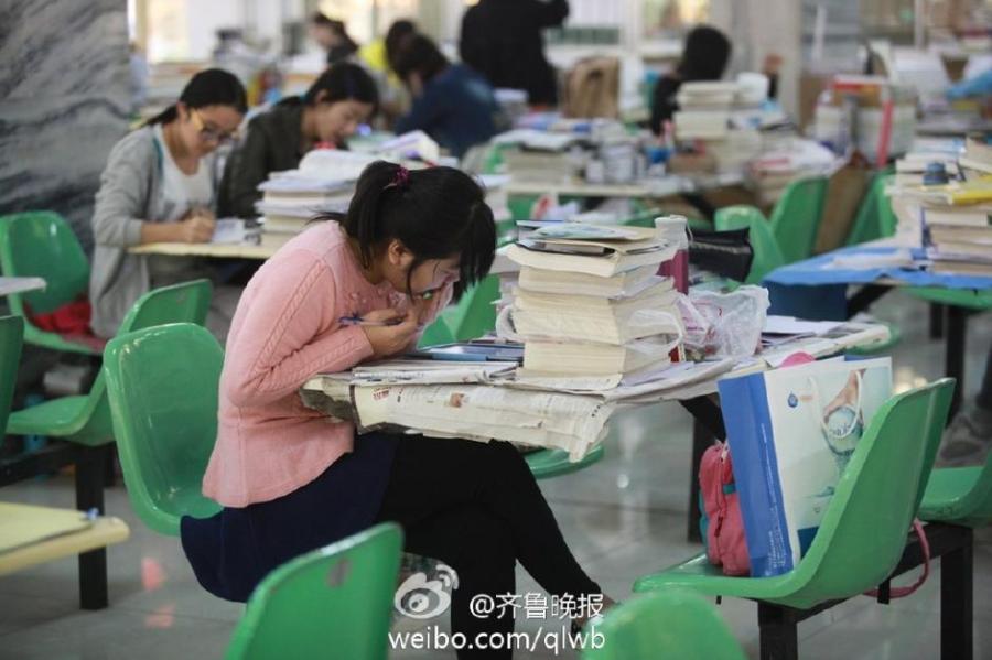 | The photo shows students of a university in Jinan, east China's Shandong province, studying in the school canteen to prepare for the postgraduate entrance examination. According to a student, there is only one classroom building nearby, and most of its classrooms were already occupied for lectures. [Photo: weibo.com/qlwb] |