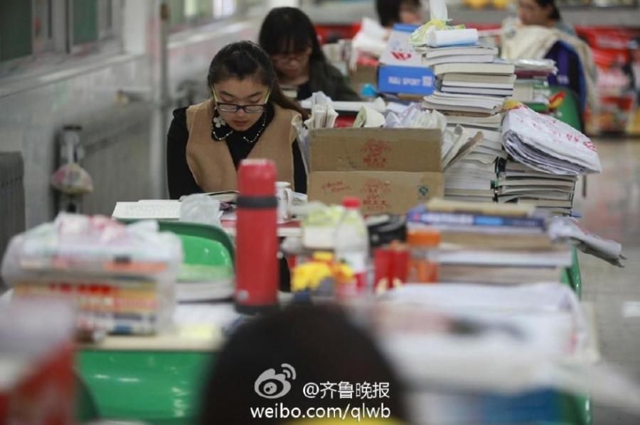 The photo shows students of a university in Jinan, east China's Shandong province, studying in the school canteen to prepare for the postgraduate entrance examination. According to a student, there is only one classroom building nearby, and most of its classrooms were already occupied for lectures. [Photo: weibo.com/qlwb]