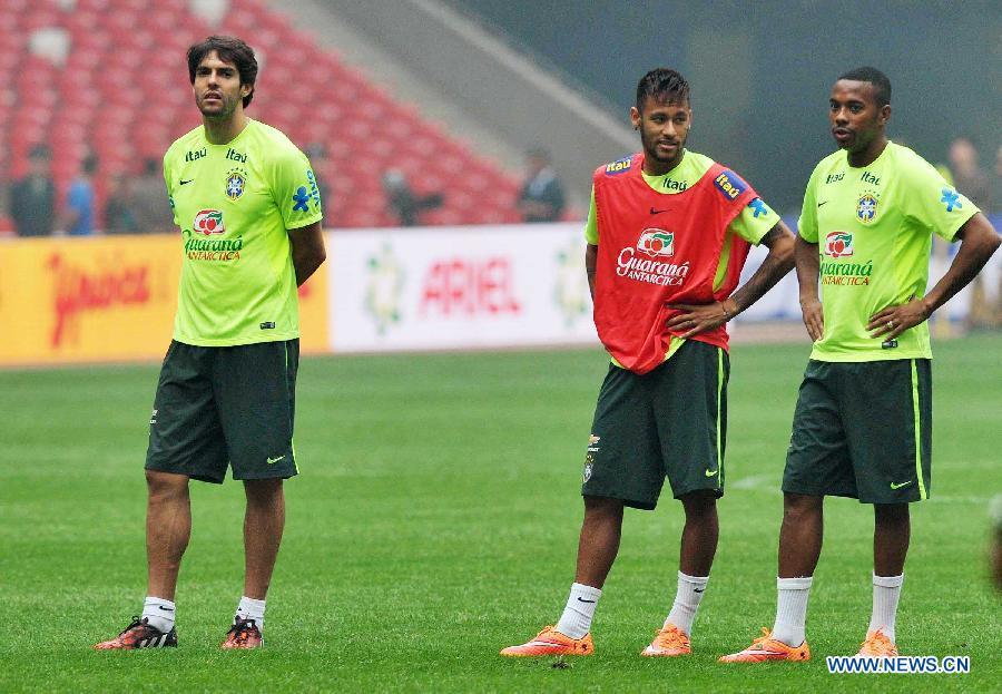 Brazil's Naymar (C) and Kaka (L) attend a training session one day before a friendly football match between the Brazilian and Argentinian national teams in Beijing, capital of China, Oct 10, 2014. (Xinhua/Gong Lei)