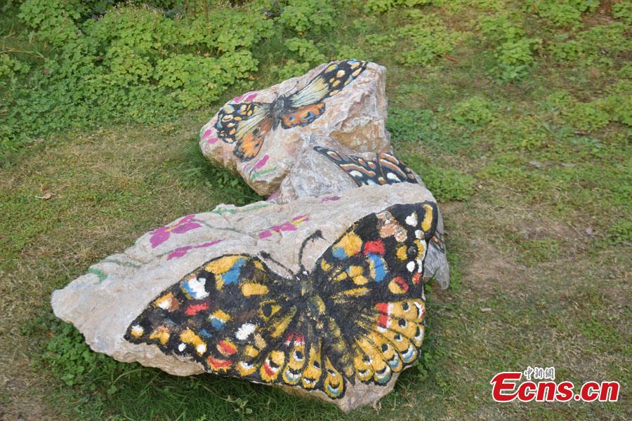 | An artist has recently turned plain old rocks into cute paintings in the Mei Cheng Park in Nanyang, China's Henan Province, attracting many tourists to visit the area. (Photo: China News Service/Han Zhangyun) |