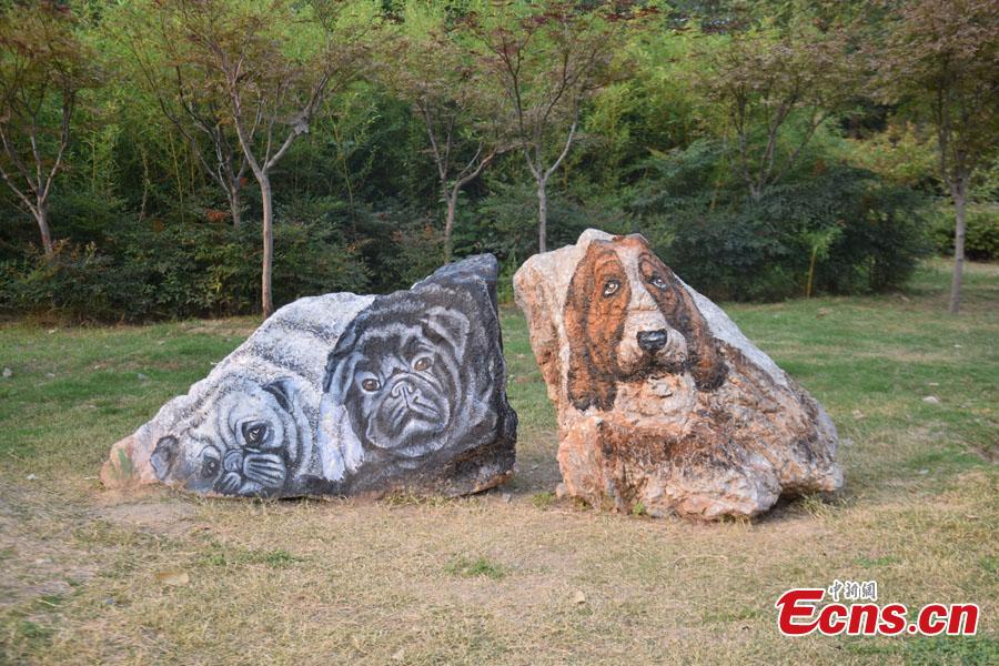An artist has recently turned plain old rocks into cute paintings in the Mei Cheng Park in Nanyang, China's Henan Province, attracting many tourists to visit the area. (Photo: China News Service/Han Zhangyun)