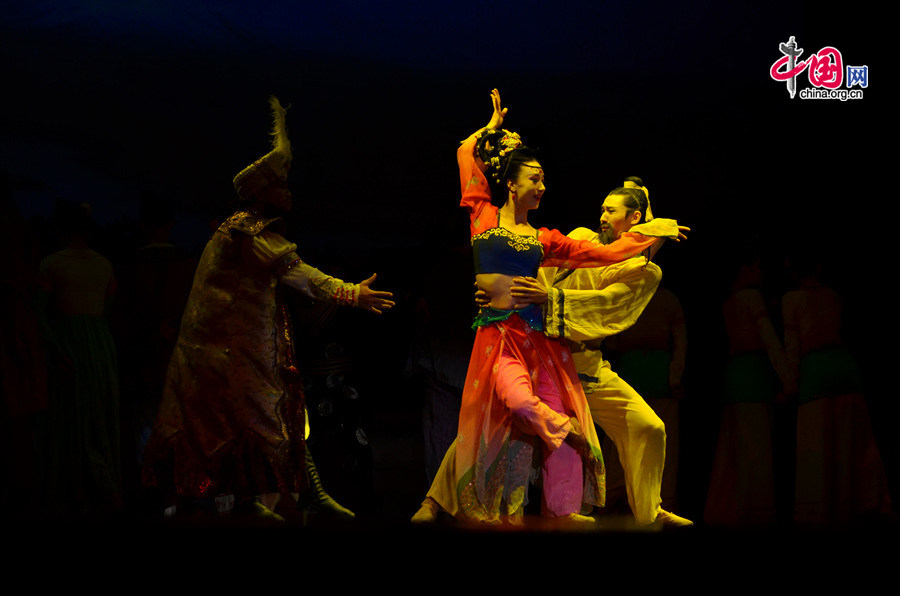 | Artists perform the dance drama "Silk Road" in Lanzhou on Thursday, Oct. 9, 2014, as part of the activities marking the 3rd International Culture Industry Conference, which is being held in the city. [Photo by Su Yadong / China.org.cn] |