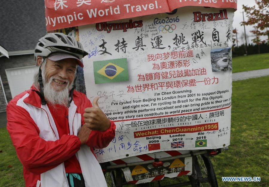 Olympic rickshaw rider Chen Guanming is seen with his tricycle in Vancouver, Canada, Oct. 10, 2014. Chinese 58-year-old farmer Chen Guanming pedalled his rickshaw to 18 countries in the past 13 years. He will take his route from Canada to Brazil to mark his 3rd attendance of the Olympic Games venue in Rio de Janeiro in 2016 after the London and Beijing Olympic Games. His journey is aimed at bringing Olympic spirit and national pride to people across the world and also raise the awareness of environment protection. (Xinhua/Liang Sen)