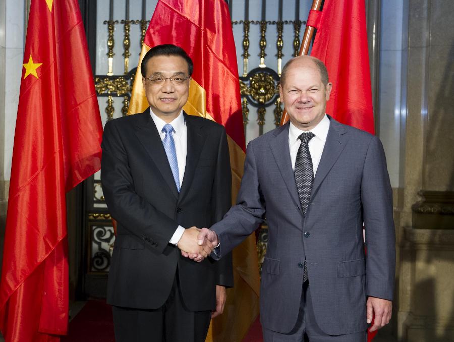 | Chinese Premier Li Keqiang (L) meets with Mayor of Hamburg Olaf Scholz in Hamburg, Germany, Oct. 11, 2014. (Xinhua/Xie Huanchi) |