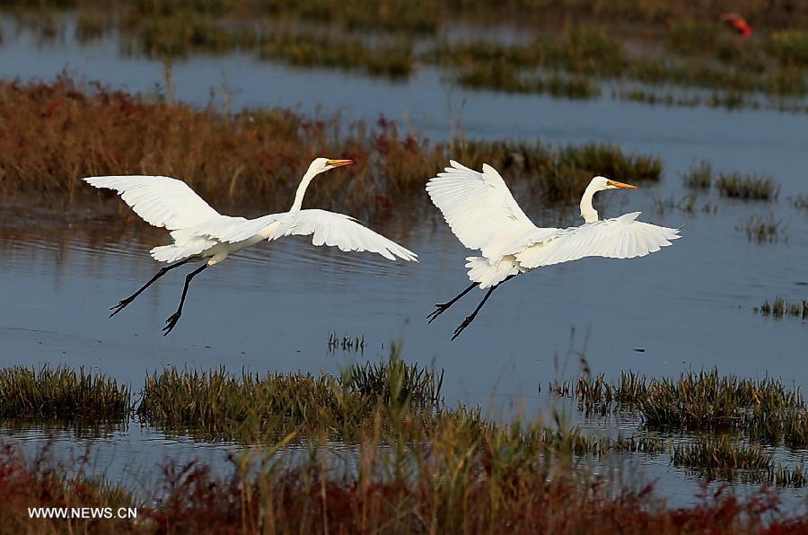 Egrets are seen on a wetland of the port city Qinhuangdao in north China's Hebei Province, Oct. 11, 2014. Thanks to the environment protection, the wetland has become a habitat to rest for over 10 million migrating birds yearly. (Xinhua/Yang Shiyao)