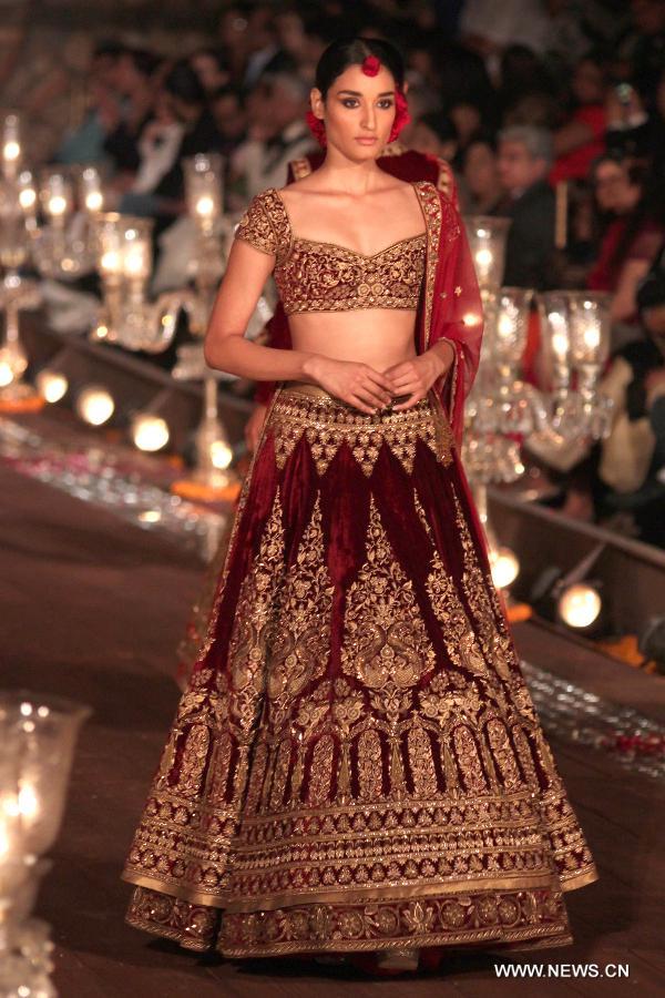 A model displays a creation of Indian fashion designer Rohit Bal during the Grand Finale of "Wills Lifestyle India Fashion Week Spring-Summer 2015" in New Delhi, India, Oct. 12, 2014. (Xinhua/Partha Sarkar)