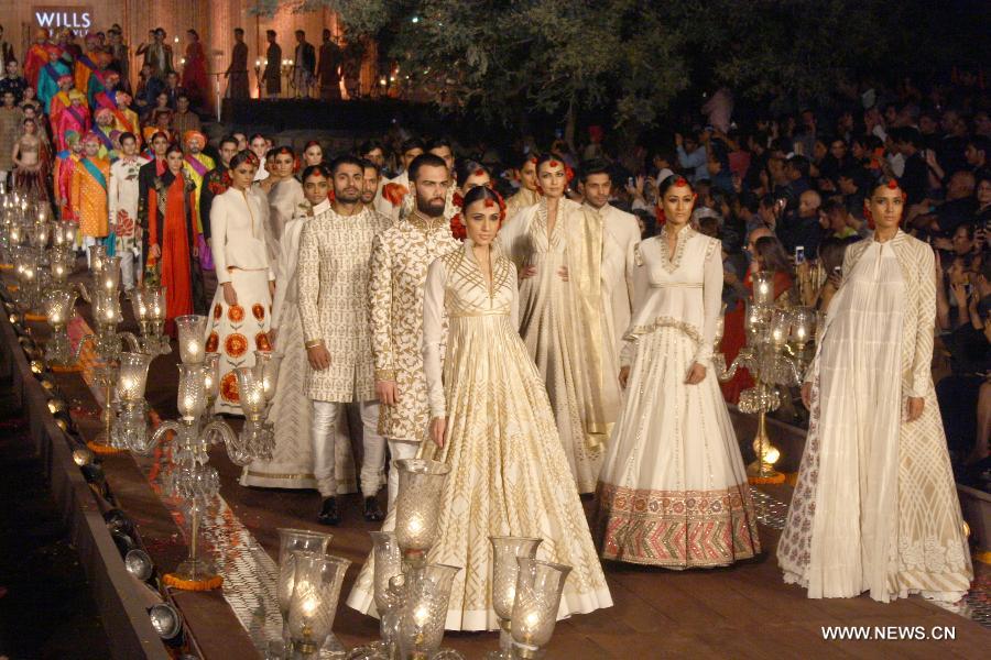 Models display creations of Indian fashion designer Rohit Bal during the Grand Finale of "Wills Lifestyle India Fashion Week Spring-Summer 2015" in New Delhi, India, Oct. 12, 2014. (Xinhua/Partha Sarkar)