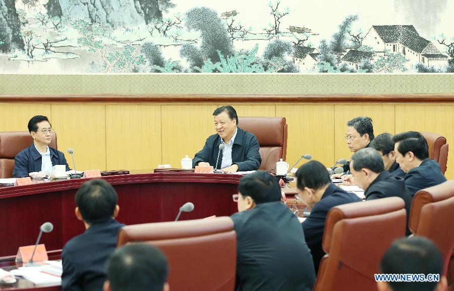 Liu Yunshan (2nd L), a member of the Standing Committee of the Political Bureau of the Communist Party of China Central Committee, presides over a meeting on the Party's "mass-line" campaign in Beijing, China, Oct. 12, 2014. (Xinhua/Yao Dawei)