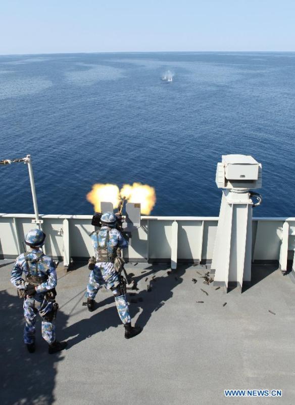 | Soldiers of Chinese People's Liberation Army Navy take part in a shoot training on Changbaishan warship, October 11, 2014. Changbaishan warship is part of the 18th batch of convoy fleet sent by the Chinese People's Liberation Army Navy for escort missions in the Gulf of Aden. (Xinhua/Zhang Yuelin) |