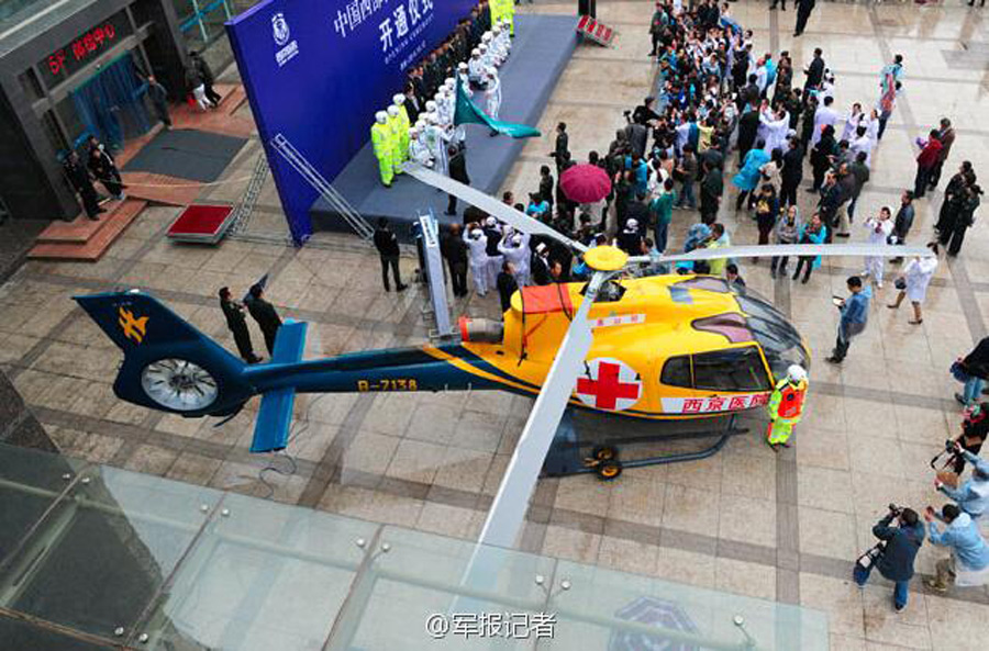 On Oct. 12, 2014, the Medical Air Rescue Service is officially launched at Xijing Hospital of the Fourth Military Medical University in Xi'an, northwest China's Shaanxi province. The service will cover the whole province, and as a public welfare service, it will only charge the flight cost. In case of natural disasters and public emergencies, the service will be offered free of charge. (Photo/weibo.com)
