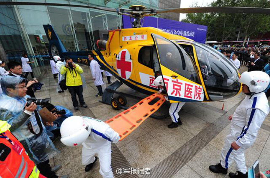 On Oct. 12, 2014, the Medical Air Rescue Service is officially launched at Xijing Hospital of the Fourth Military Medical University in Xi'an, northwest China's Shaanxi province. The service will cover the whole province, and as a public welfare service, it will only charge the flight cost. In case of natural disasters and public emergencies, the service will be offered free of charge. (Photo/weibo.com)