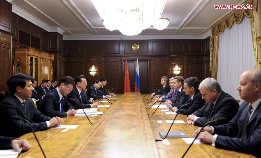 | Chinese Premier Li Keqiang (3rd L) meets with Sergei Naryshkin (4th R), chairman of the Russian State Duma, in Moscow Oct. 13, 2014. (Xinhua/Zhang Duo) |