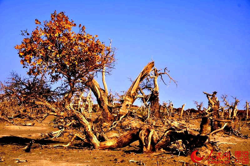 | The dead forest is located in Ejin Banner, north China’s of Inner Mongolia Autonomous Region. It used to be a thick populus euphratica forest. Because of rivers diversion in history, the trees died of drought. The grotesque dead trees present a mysterious and wild scene. It is often called “the odd forest” by tourists. (Photo source: people.cn) |