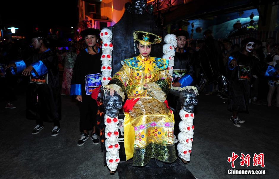 Performers dressed up as zombies, ghost brides, traditional Chinese monsters Heibai Wuchang and vampires come out at the 3rd "Halloween Festival" at Happy Valley in Wuhan, central China's Hubei province on the night of Oct. 11, 2014. (CNS/Zhang Chang)