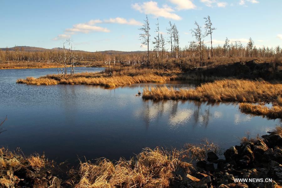 Photo taken on Oct. 12, 2014 shows the autumn scenery of the Dujuan Lake in the Aershan National Forest Park, north China's Inner Mongolia Autonomous Region. (Xinhua)
