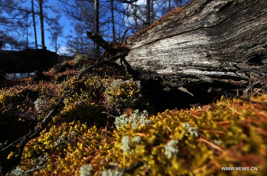 Photo taken on Oct. 12, 2014 shows the scenery of moss lying by a dead wood in the Aershan National Forest Park, north China's Inner Mongolia Autonomous Region. (Xinhua)