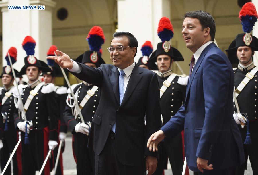 Chinese Premier Li Keqiang (L front) attends a welcoming ceremony held by Italian Prime Minister Matteo Renzi in Rome, Italy, Oct. 14, 2014. (Xinhua/Li Xueren)