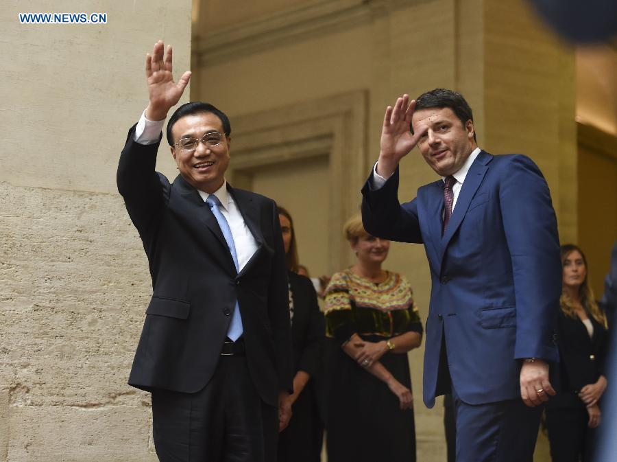 Chinese Premier Li Keqiang (L front) attends a welcoming ceremony held by Italian Prime Minister Matteo Renzi in Rome, Italy, Oct. 14, 2014. (Xinhua/Li Xueren)