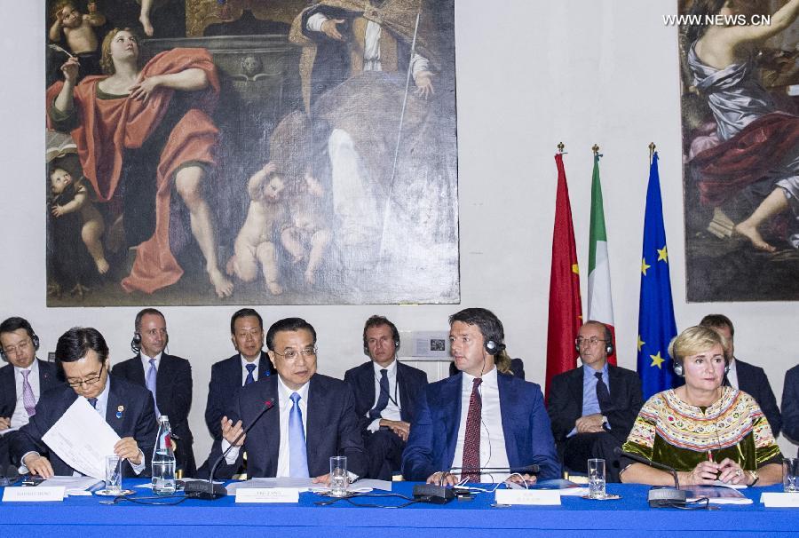 Chinese Premier Li Keqiang and Italian Prime Minister Matteo Renzi meet with members of China-Italy entrepreneur committee and entrepreneur representatives in Rome, Italy, Oct. 14, 2014. (Xinhua/Wang Ye)