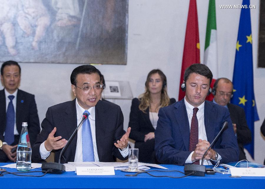 | Chinese Premier Li Keqiang and Italian Prime Minister Matteo Renzi meet with members of China-Italy entrepreneur committee and entrepreneur representatives in Rome, Italy, Oct. 14, 2014. (Xinhua/Wang Ye) |