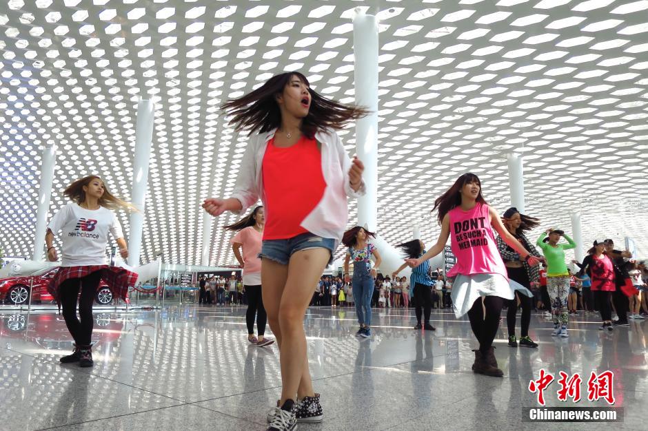 Dancers perform street dance in the departure lounge of Shenzhen Bao'an International Airport on Oct.12, 2014. The airport has witnessed 328 million trips and transported more than 9 million tons of goods in 23 years. (CNS/Chen Wen)