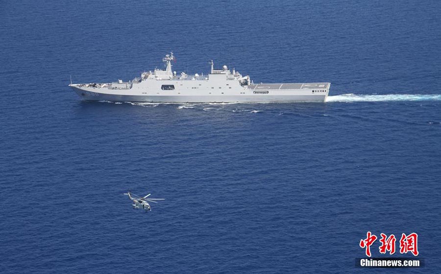 The Chinese naval escort fleet executing escort mission in the Gulf of Aden carries out ship-based helicopter flight training on Oct. 13, 2014. In view of the characteristics of the recent pirate activities, the fleet aims to improve the ability to deal with emergency situation through the training. (Chinanews.com/Deng Minghua)