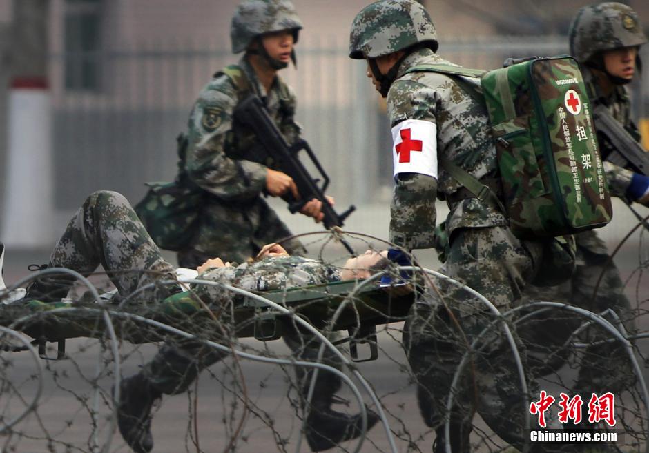 Norman Bethune Non-Commissioned Officer Medical School conducts adaptive medical exercise in Shijiazhuang, north China's Hebei province on Oct. 10, 2014. (CNS/Song Jihe)