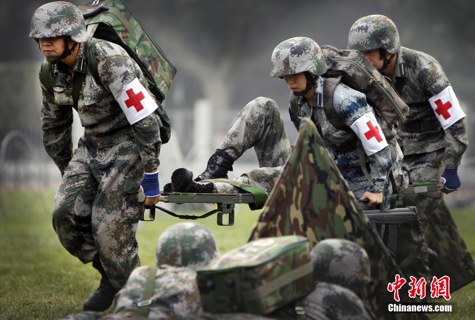 Norman Bethune Non-Commissioned Officer Medical School conducts adaptive medical exercise in Shijiazhuang, north China's Hebei province on Oct. 10, 2014. (CNS/Song Jihe)