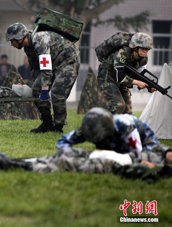 Norman Bethune Non-Commissioned Officer Medical School conducts adaptive medical exercise in Shijiazhuang, north China's Hebei province on Oct. 10, 2014. (CNS/Song Jihe)