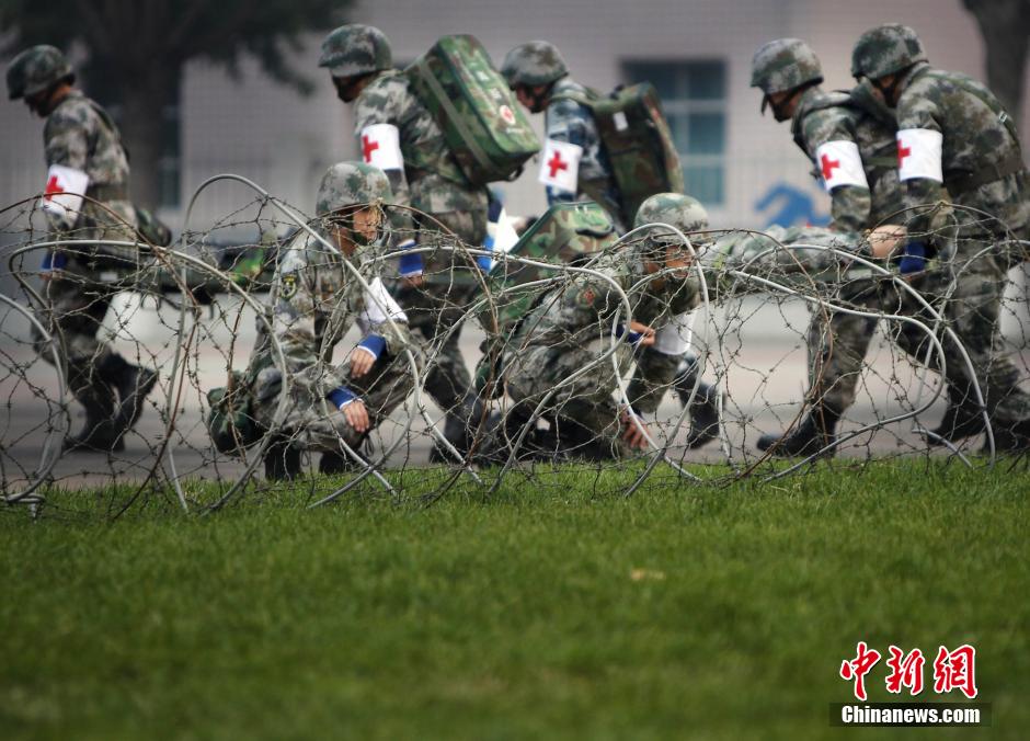 Norman Bethune Non-Commissioned Officer Medical School conducts adaptive medical exercise in Shijiazhuang, north China's Hebei province on Oct. 10, 2014. (CNS/Song Jihe)