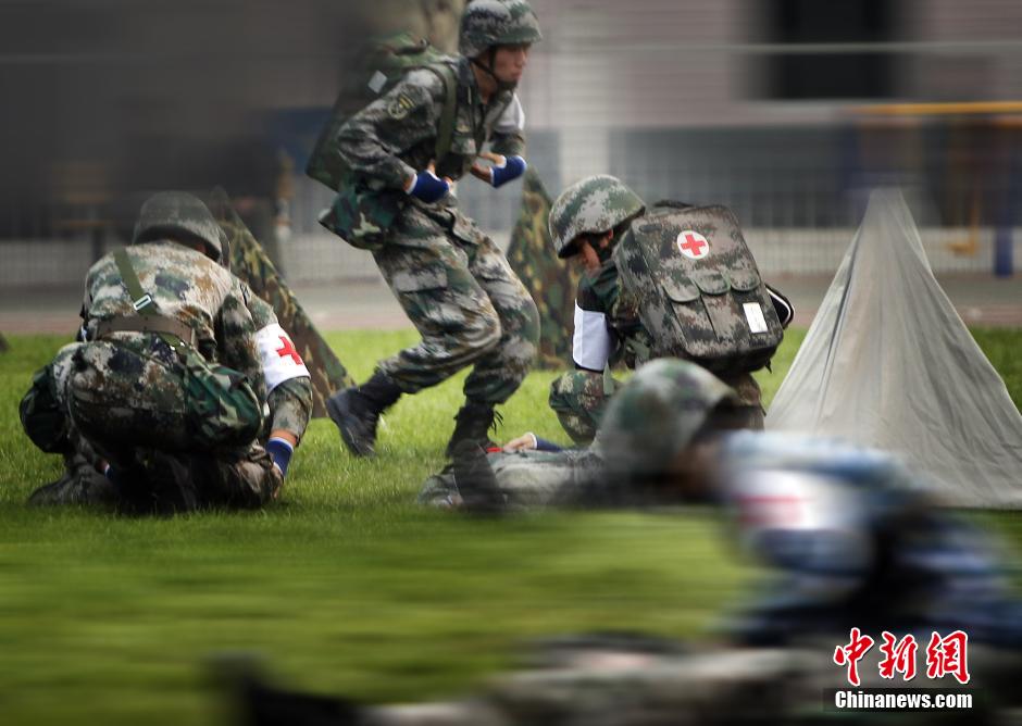 Norman Bethune Non-Commissioned Officer Medical School conducts adaptive medical exercise in Shijiazhuang, north China's Hebei province on Oct. 10, 2014. (CNS/Song Jihe)