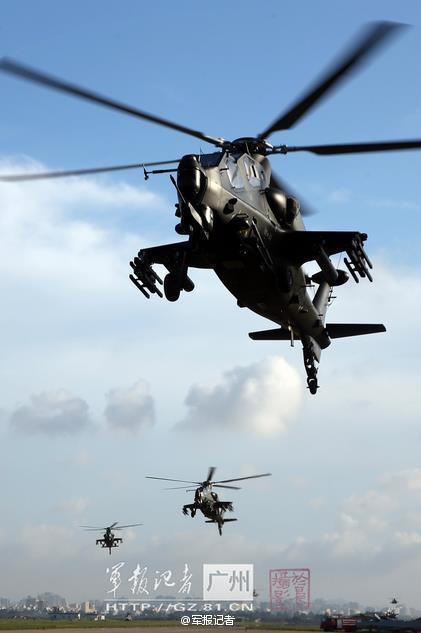 An army aviation brigade of Guangzhou Military Region conducts a drill for the Z-10 attack helicopter formation on Oct. 13, 2014. (Photo source: Microblog of a PLA Daily reporter)