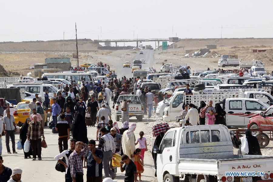 Groups of citizens gather at the only crossing between Hawija and the city of Kirkuk, northern Iraq, on Oct. 15, 2014. Hawija is about 20km southwest of Kirkuk which is controlled by the Islamic state (IS). (Xinhua/Dena Assad)