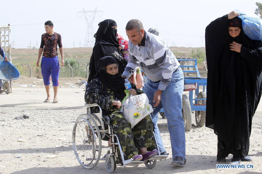 An elderly woman pass the only crossing between Hawija and the city of Kirkuk, northern Iraq, on Oct. 15, 2014. Hawija is about 20km southwest of Kirkuk which is controlled by the Islamic state (IS). (Xinhua/Dena Assad)
