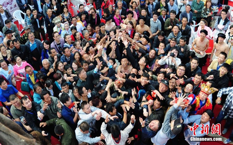 People scramble for the cash thrown by two local real estate developers in Zhangjiajie, central China's Hunan province on Oct. 14.(CNS/Yang Huafeng)