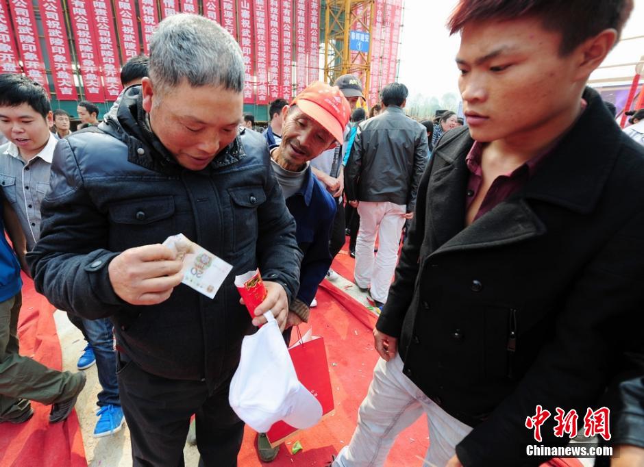 | People scramble for the cash thrown by two local real estate developers in Zhangjiajie, central China's Hunan province on Oct. 14.(CNS/Yang Huafeng) |