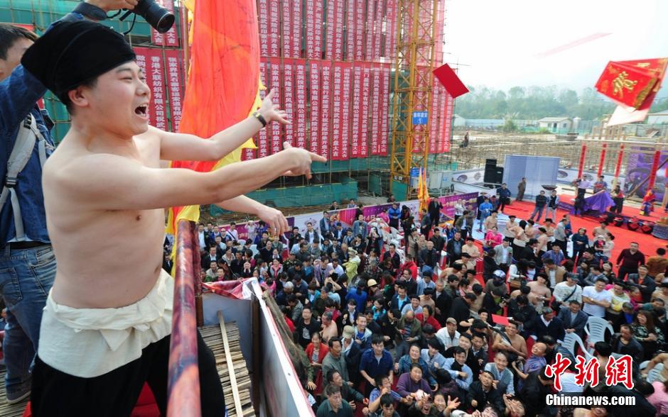 Two local real estate developers throw red envelopes containing more than $8,000 to the people as sales of their building began in Zhangjiajie, central China's Hunan province on Oct. 14. (CNS/Yang Huafeng)