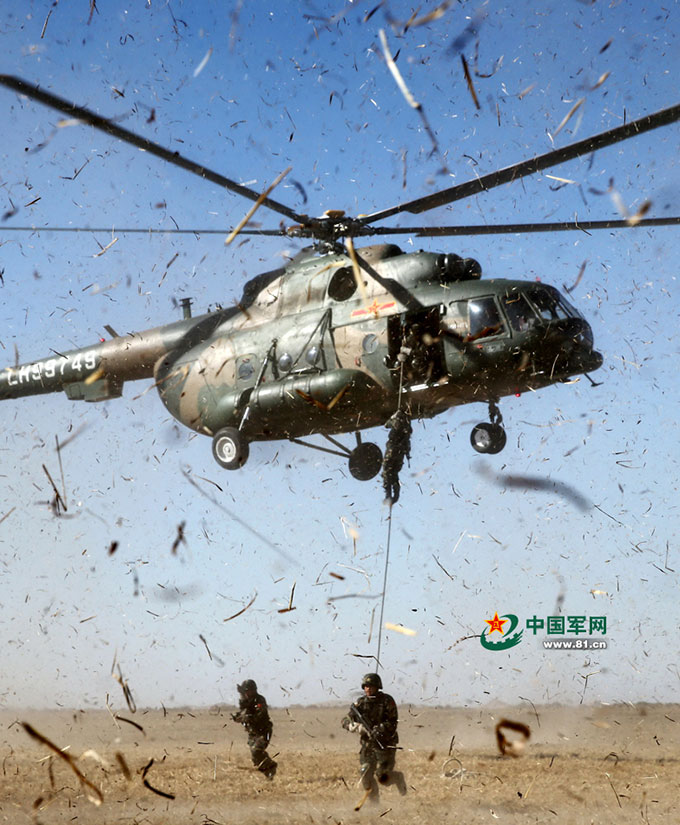 On Oct. 13, 2014, a joint campaign training is carried out by a mechanized infantry regiment and an aviation unit in Shenyang Military Region. Soldiers will enhance their capabilities of airborne operation in an environment close to the real combats, thereby integrally improving the troops' combat capability. (Photo/81.cn)