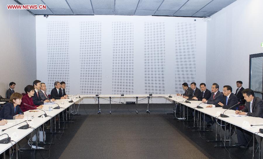 | Chinese Premier Li Keqiang (2nd R) meets with South Korean President Park Geun-hye (2nd L) in Milan, Italy, Oct. 16, 2014. (Xinhua/Wang Ye) |