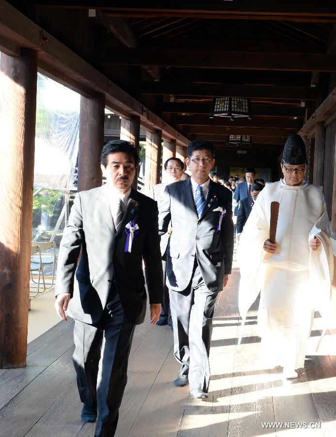 Japanese lawmakers visit the Yasukuni Shrine in Tokyo Oct. 17, 2014. A total of 110 Japanese lawmakers from a nonpartisan group visited the Yasukuni Shrine Friday morning, which honors convicted World War II Class-A war criminals along with war dead. (Xinhua/Ma Ping)