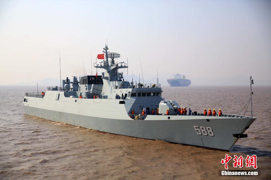 | The newly-commissioned warship Quanzhou fires its main gun at the target in a maritime drill on October 15, 2014. Recently, the guided missile frigate Quanzhou of the East China Sea Fleet of the Chinese People's Liberation Army Navy (PLAN) has been engaged in coordination training with other warships of different types on various subjects including ship steering, refueling, ship towing and night navigation. This training is designed to verify the training effectiveness and speed up the generation of the combat capability of the frigate which was commissioned to the PLAN two months ago. (China News Service/Zhou Daoxian) |