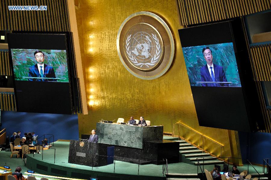 | China's deputy permanent representative to the UN Wang Min delivers a speech during a meeting of the 69th Session of the UN General Assembly on Africa's development in New York, on Oct.17, 2014. Wang Min called for joint international efforts to fight the Ebola epidemic, saying the epidemic has become a common non-traditional security challenge to the international community. (Xinhua/Niu Xiaolei) |