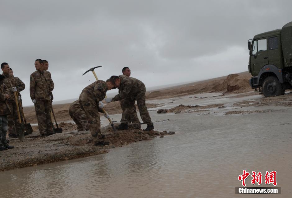 Soldiers rush to repair the road on Sept. 26, 2014. (Chinanews/Liu Guanguan)