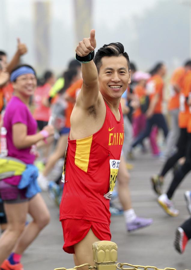 A participant waves as he runs in the 2014 Beijing International Marathon in the haze-surrounded Beijing, capital of China, Oct. 19, 2014. (Xinhua/Wang Zhen)