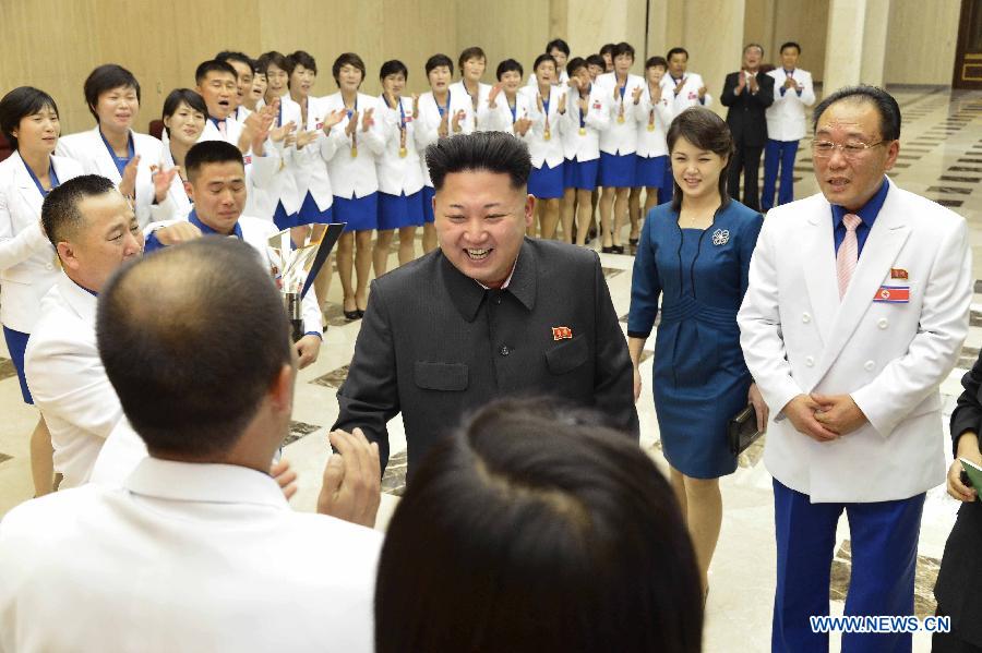 This photo provided by Korean Central News Agency (KCNA) on Oct. 19, 2014 shows top leader of the Democratic People's Republic of Korea (DPRK) Kim Jong Un, accompanied by his wife Ri Sol-Ju (2nd R) meeting with gold medalists of the 17th Asian Games and recent world champions and their coaches in Pyongyang. (Xinhua/KCNA)