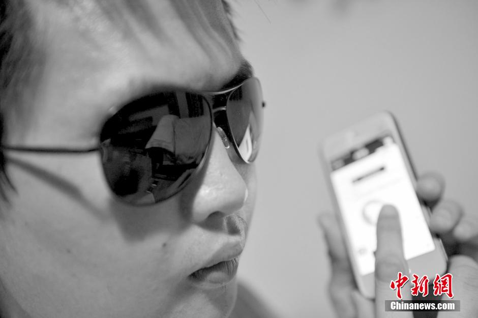 | Xia Li "reads" his friends' entries in WeChat, a Chinese mobile text and voice messaging communication service, by hearing. (CNS/Liu Zhankun) |