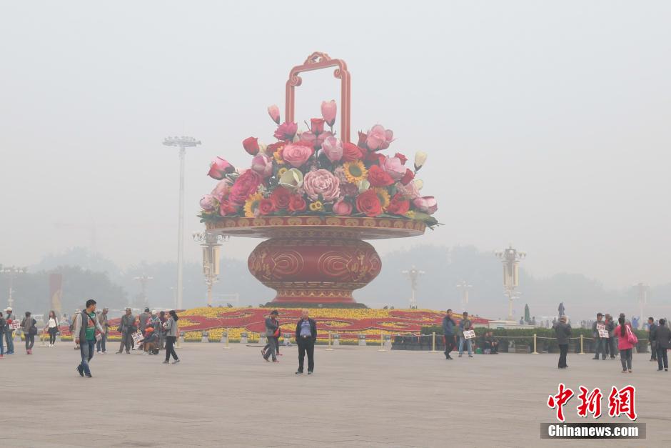 Visitors walk in the Tiananmen Square in the heavy smog. (Photo/CNS)